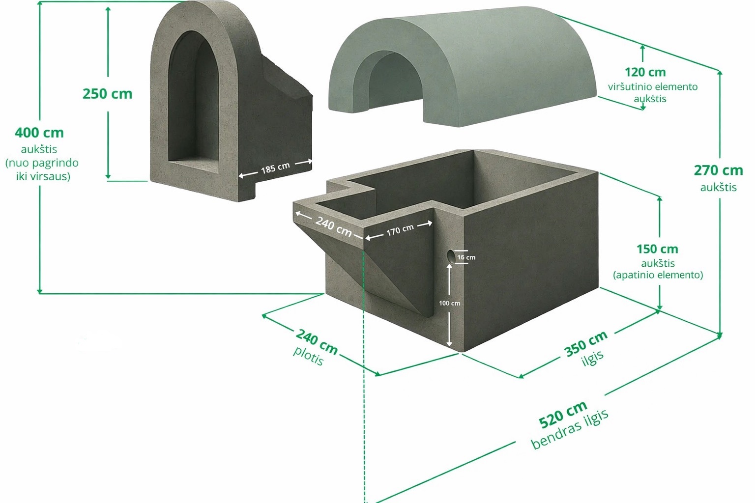 Gelžbetonio rūsys su apvaliu skliautu ir uždengtu laiptų skyriumi – raktiškas komplektinis sprendimas. Šis betoninis rūsys su laiptais puikiai tinka kaip sodo rūsys, požeminė slėptuvė ar betoninis bunkeris šeimai.